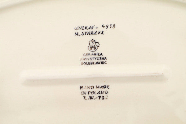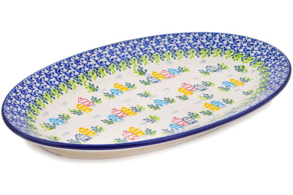 This Sweet Little Village 14" Platter was handmade and hand decorated in Boleslawiec, Poland by skilled artisans according to old traditional methods. This is a Polish pottery Signature Unikat, which means that it has been hand painted with both sponges and brushes and it is signed by the artist who painted it. Unikat pieces are the most intricate works of art. Larger Unikat items take hours of very careful work to finish. This Polish stoneware is microwave, dishwasher, freezer, and oven safe up to 480°F. It does not contain lead or cadmium. It is part of the Sweet Little Village Collection.