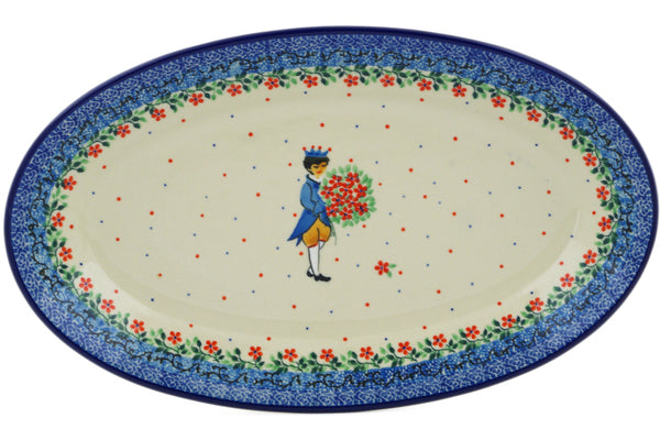 This Charming Prince 15" Platter was handmade and hand decorated in Boleslawiec, Poland by skilled artisans according to old traditional methods. This is a Polish pottery Signature Unikat, which means that it has been hand painted with both sponges and brushes and it is signed by the artist who painted it. Unikat pieces are the most intricate works of art. Larger Unikat items take hours of very careful work to finish. This Polish stoneware is microwave, dishwasher, freezer, and oven safe up to 480°F. It does not contain lead or cadmium. It is part of the Charming Prince Collection.