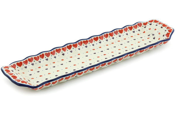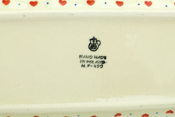 This Red Hearts Delight 20" Platter with Handles was handmade and hand decorated in Boleslawiec, Poland by skilled artisans according to old traditional methods. This Polish stoneware is microwave, dishwasher, freezer, and oven safe up to 480°F. It does not contain lead or cadmium. It is part of the Red Hearts Delight Collection.