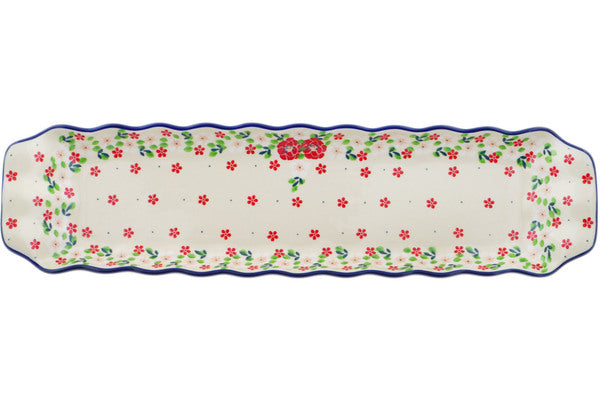 This Rosy Cheeks 20" Platter with Handles was handmade and hand decorated in Boleslawiec, Poland by skilled artisans according to old traditional methods. This Polish stoneware is microwave, dishwasher, freezer, and oven safe up to 480°F. It does not contain lead or cadmium. It is part of the Rosy Cheeks Collection.