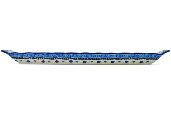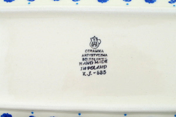 This Scattered Blossoms 20" Platter with Handles was handmade and hand decorated in Boleslawiec, Poland by skilled artisans according to old traditional methods. This Polish stoneware is microwave, dishwasher, freezer, and oven safe up to 480°F. It does not contain lead or cadmium. It is part of the Scattered Blossoms Collection.