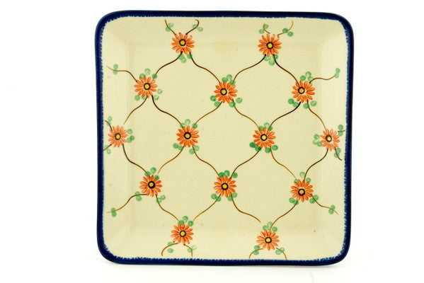 This Marmalade Trellis 8" Square Platter was handmade and hand decorated in Boleslawiec, Poland by skilled artisans according to old traditional methods. This Polish stoneware is microwave, dishwasher, freezer, and oven safe up to 480°F. It does not contain lead or cadmium. It is part of the Marmalade Trellis Collection.