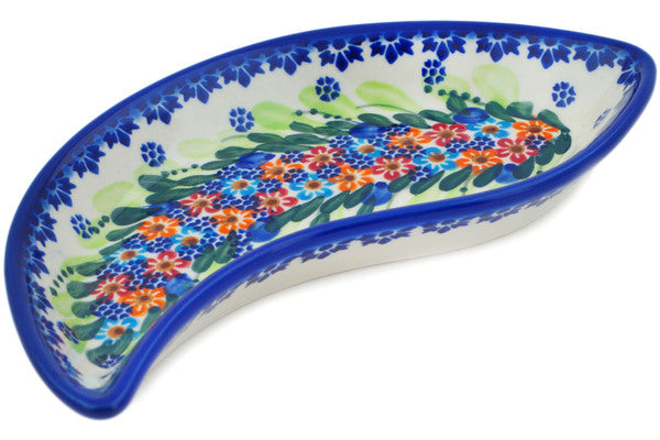 This Starburst Garland 8" Platter was handmade and hand decorated in Boleslawiec, Poland by skilled artisans according to old traditional methods. This is a Polish pottery Signature Unikat, which means that it has been hand painted with both sponges and brushes and it is signed by the artist who painted it. Unikat pieces are the most intricate works of art. Larger Unikat items take hours of very careful work to finish. This Polish stoneware is microwave, dishwasher, freezer, and oven safe up to 480°F. It does not contain lead or cadmium. It is part of the Starburst Garland Collection.