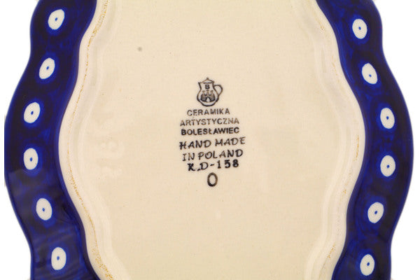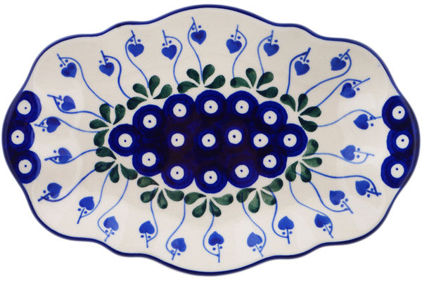 This Bleeding Heart Peacock 9" Platter was handmade and hand decorated in Boleslawiec, Poland by skilled artisans according to old traditional methods. This Polish stoneware is microwave, dishwasher, freezer, and oven safe up to 480°F. It does not contain lead or cadmium. It is part of the Bleeding Heart Peacock Collection.
