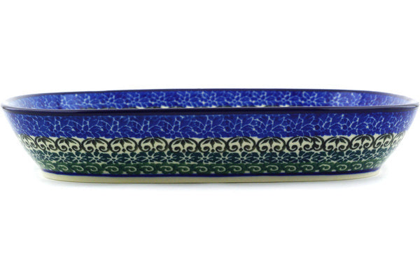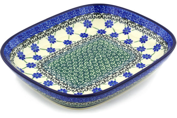 This Blue Daisies 9" Platter was handmade and hand decorated in Boleslawiec, Poland by skilled artisans according to old traditional methods. This Polish stoneware is microwave, dishwasher, freezer, and oven safe up to 480°F. It does not contain lead or cadmium. It is part of the Blue Daisies Collection.