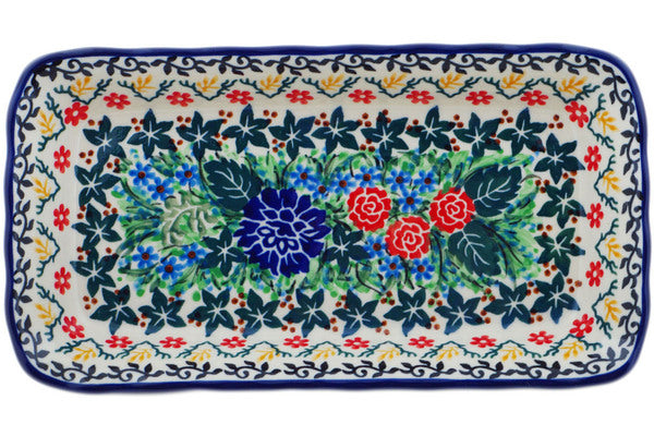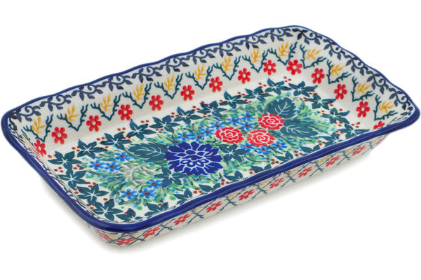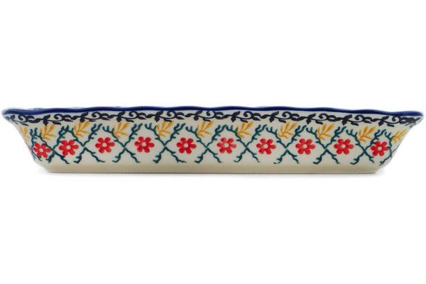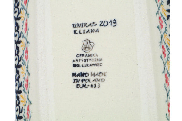 This Garden Trellis 9" Platter was handmade and hand decorated in Boleslawiec, Poland by skilled artisans according to old traditional methods. This is a Polish pottery Signature Unikat, which means that it has been hand painted with both sponges and brushes and it is signed by the artist who painted it. Unikat pieces are the most intricate works of art. Larger Unikat items take hours of very careful work to finish. This Polish stoneware is microwave, dishwasher, freezer, and oven safe up to 480°F. It does not contain lead or cadmium. It is part of the Garden Trellis Collection.