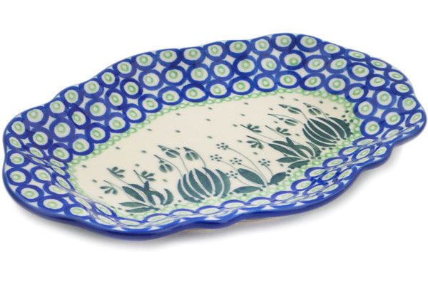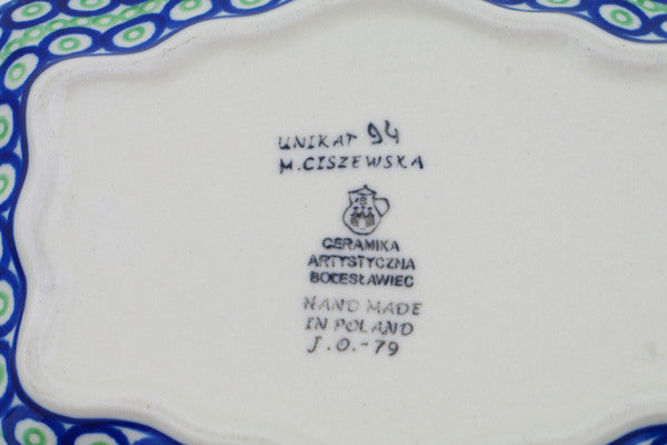 This Weeping Tulips 9" Platter was handmade and hand decorated in Boleslawiec, Poland by skilled artisans according to old traditional methods. This is a Polish pottery Signature Unikat, which means that it has been hand painted with both sponges and brushes and it is signed by the artist who painted it. Unikat pieces are the most intricate works of art. Larger Unikat items take hours of very careful work to finish. This Polish stoneware is microwave, dishwasher, freezer, and oven safe up to 480°F. It does not contain lead or cadmium. It is part of the Weeping Tulips Collection.