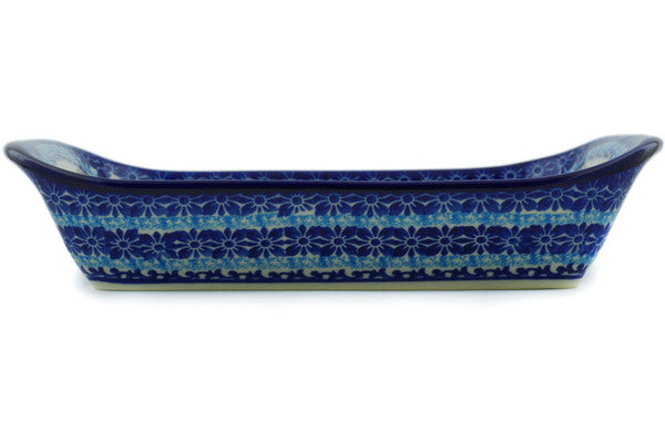 This Bold Blue Poppies 11" Platter with Handles was handmade and hand decorated in Boleslawiec, Poland by skilled artisans according to old traditional methods. This is a Polish pottery Signature Unikat, which means that it has been hand painted with both sponges and brushes and it is signed by the artist who painted it. Unikat pieces are the most intricate works of art. Larger Unikat items take hours of very careful work to finish. This Polish stoneware is microwave, dishwasher, freezer, and oven safe up to 480°F. It does not contain lead or cadmium. It is part of the Bold Blue Poppies Collection.