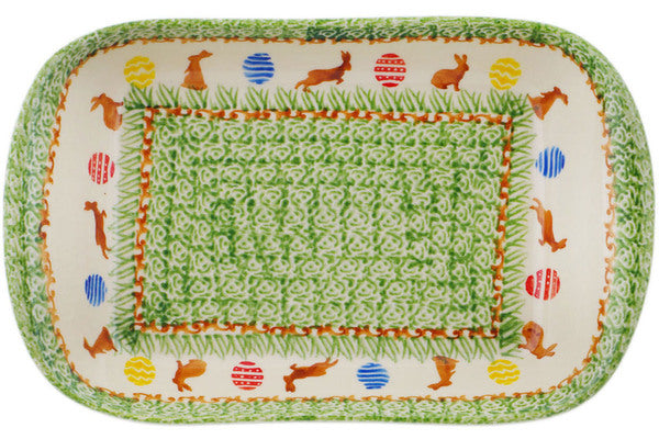 This Chocolate Bunny 11" Platter with Handles was handmade and hand decorated in Boleslawiec, Poland by skilled artisans according to old traditional methods. This Polish stoneware is microwave, dishwasher, freezer, and oven safe up to 480°F. It does not contain lead or cadmium. It is part of the Chocolate Bunny Collection.