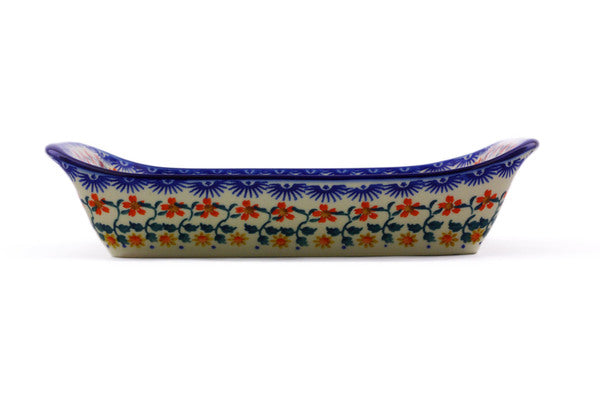 This Red Sunflower 11" Platter with Handles was handmade and hand decorated in Boleslawiec, Poland by skilled artisans according to old traditional methods. This Polish stoneware is microwave, dishwasher, freezer, and oven safe up to 480°F. It does not contain lead or cadmium. It is part of the Red Sunflower Collection.