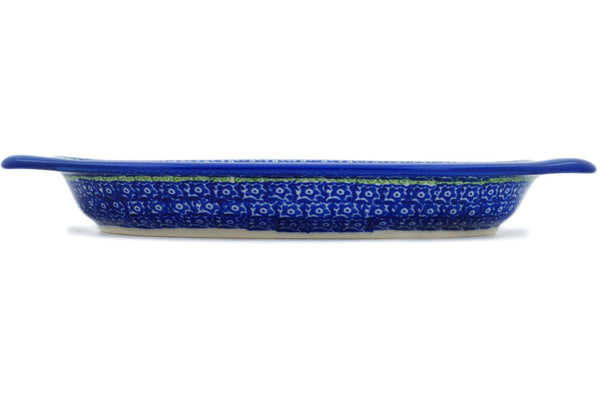 This Beekeeper Gnome 12" Platter with Handles was handmade and hand decorated in Boleslawiec, Poland by skilled artisans according to old traditional methods. This is a Polish pottery Signature Unikat, which means that it has been hand painted with both sponges and brushes and it is signed by the artist who painted it. Unikat pieces are the most intricate works of art. Larger Unikat items take hours of very careful work to finish. This Polish stoneware is microwave, dishwasher, freezer, and oven safe up to 480°F. It does not contain lead or cadmium. It is part of the Beekeeper Gnome Collection.