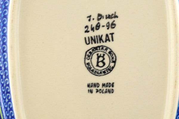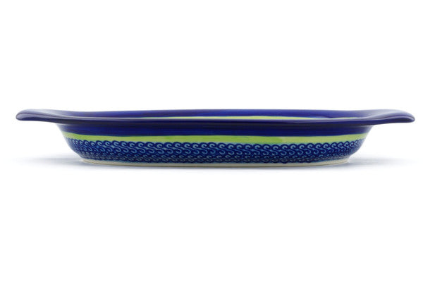 This Midnight Eclipse 12" Platter with Handles was handmade and hand decorated in Boleslawiec, Poland by skilled artisans according to old traditional methods. This Polish stoneware is microwave, dishwasher, freezer, and oven safe up to 480°F. It does not contain lead or cadmium. It is part of the Midnight Eclipse Collection.