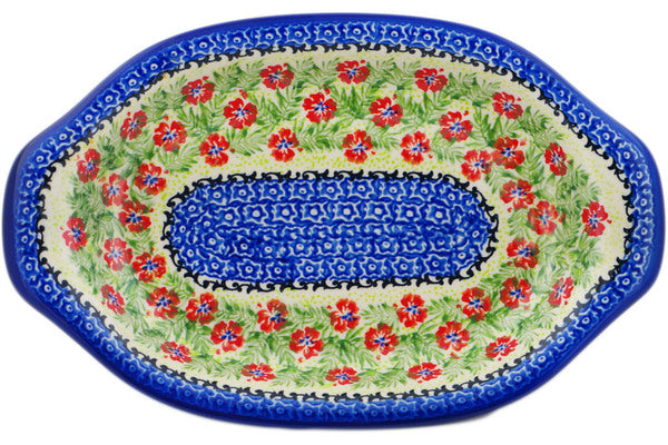 This Midsummer Bloom 12" Platter with Handles was handmade and hand decorated in Boleslawiec, Poland by skilled artisans according to old traditional methods. This Polish stoneware is microwave, dishwasher, freezer, and oven safe up to 480°F. It does not contain lead or cadmium. It is part of the Midsummer Bloom Collection.