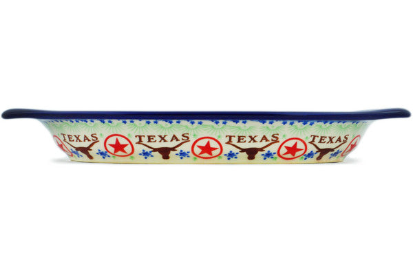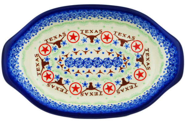 This Texas State 12" Platter with Handles was handmade and hand decorated in Boleslawiec, Poland by skilled artisans according to old traditional methods. This Polish stoneware is microwave, dishwasher, freezer, and oven safe up to 480°F. It does not contain lead or cadmium. It is part of the Texas State Collection.