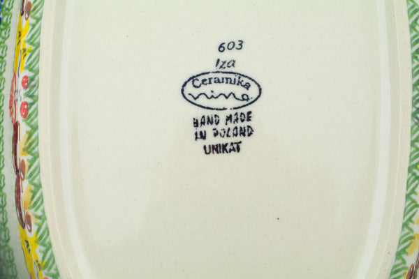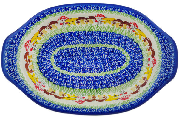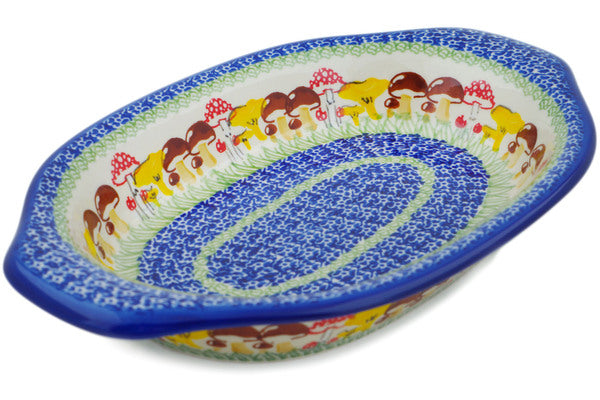 This Wild Mushroom Picking 13" Platter with Handles was handmade and hand decorated in Boleslawiec, Poland by skilled artisans according to old traditional methods. This Polish stoneware is microwave, dishwasher, freezer, and oven safe up to 480°F. It does not contain lead or cadmium. It is part of the Wild Mushroom Picking Collection.
