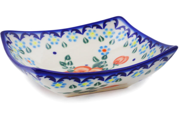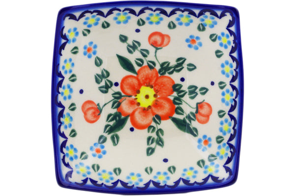 This Peach Tudor Rose 5" Square Bowl was handmade and hand decorated in Boleslawiec, Poland by skilled artisans according to old traditional methods. This Polish stoneware is microwave, dishwasher, freezer, and oven safe up to 480°F. It does not contain lead or cadmium. It is part of the Peach Tudor Rose Collection.