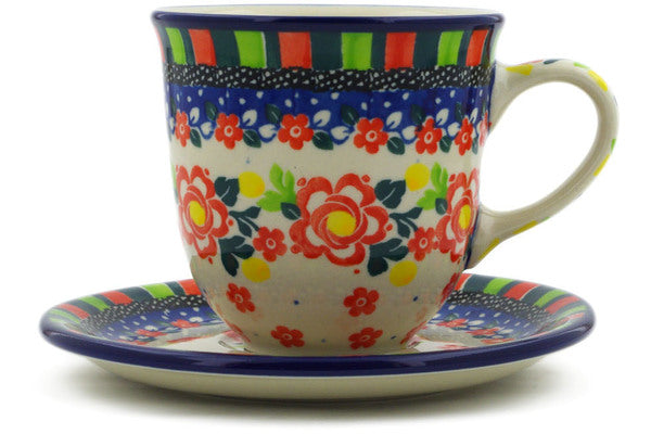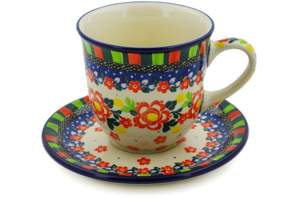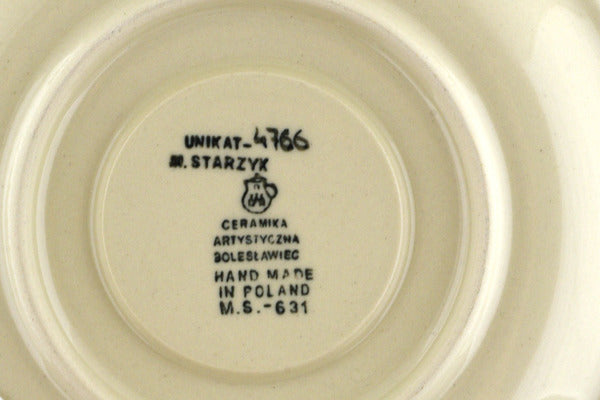 This Floral Puzzles 10 oz Cup with Saucer was handmade and hand decorated in Boleslawiec, Poland by skilled artisans according to old traditional methods. This is a Polish pottery Signature Unikat, which means that it has been hand painted with both sponges and brushes and it is signed by the artist who painted it. Unikat pieces are the most intricate works of art. Larger Unikat items take hours of very careful work to finish. This Polish stoneware is microwave, dishwasher, freezer, and oven safe up to 480°F. It does not contain lead or cadmium. It is part of the Floral Puzzles Collection.