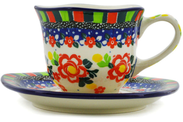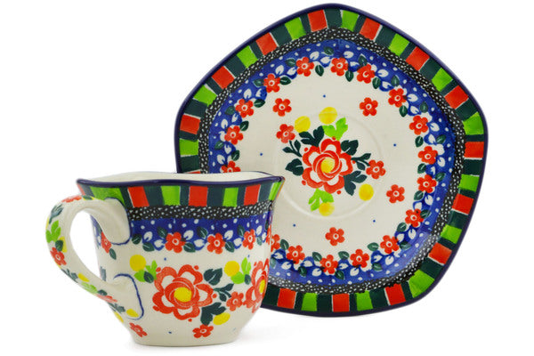 This Floral Puzzles 8 oz Cup with Saucer was handmade and hand decorated in Boleslawiec, Poland by skilled artisans according to old traditional methods. This is a Polish pottery Signature Unikat, which means that it has been hand painted with both sponges and brushes and it is signed by the artist who painted it. Unikat pieces are the most intricate works of art. Larger Unikat items take hours of very careful work to finish. This Polish stoneware is microwave, dishwasher, freezer, and oven safe up to 480°F. It does not contain lead or cadmium. It is part of the Floral Puzzles Collection.