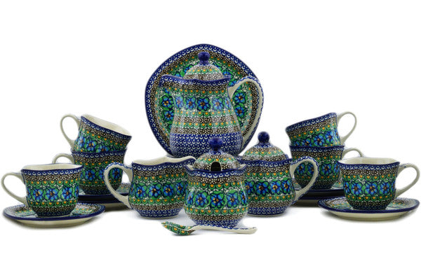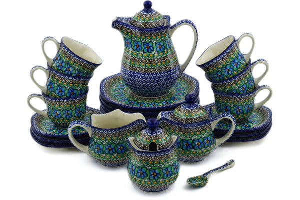 This Mardi Gras 29 oz Dessert Set for 6 was handmade and hand decorated in Boleslawiec, Poland by skilled artisans according to old traditional methods. This is a Polish pottery Signature Unikat, which means that it has been hand painted with both sponges and brushes and it is signed by the artist who painted it. Unikat pieces are the most intricate works of art. Larger Unikat items take hours of very careful work to finish. This Polish stoneware is microwave, dishwasher, freezer, and oven safe up to 480°F. It does not contain lead or cadmium. It is part of the Mardi Gras Collection.