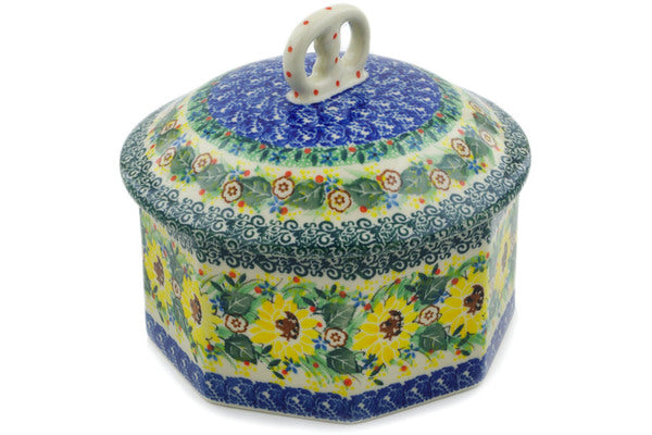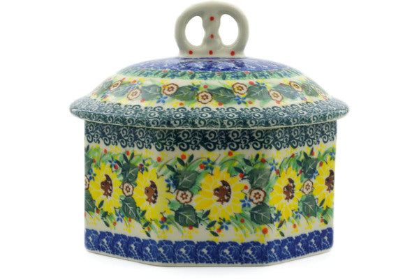This Yellow Garden 6" Pretzel Jar 6" was handmade and hand decorated in Boleslawiec, Poland by skilled artisans according to old traditional methods. This is a Polish pottery Signature Unikat, which means that it has been hand painted with both sponges and brushes and it is signed by the artist who painted it. Unikat pieces are the most intricate works of art. Larger Unikat items take hours of very careful work to finish. This Polish stoneware is microwave, dishwasher, freezer, and oven safe up to 480°F. It does not contain lead or cadmium. It is part of the Yellow Garden Collection.