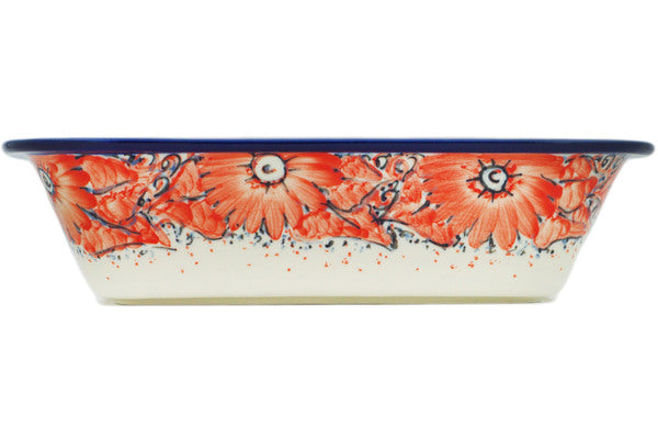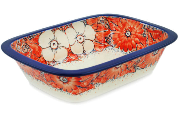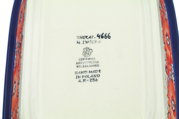This Peachy Keen 10" Rectangular Baker was handmade and hand decorated in Boleslawiec, Poland by skilled artisans according to old traditional methods. This is a Polish pottery Signature Unikat, which means that it has been hand painted with both sponges and brushes and it is signed by the artist who painted it. Unikat pieces are the most intricate works of art. Larger Unikat items take hours of very careful work to finish. This Polish stoneware is microwave, dishwasher, freezer, and oven safe up to 480°F. It does not contain lead or cadmium. It is part of the Peachy Keen Collection.
