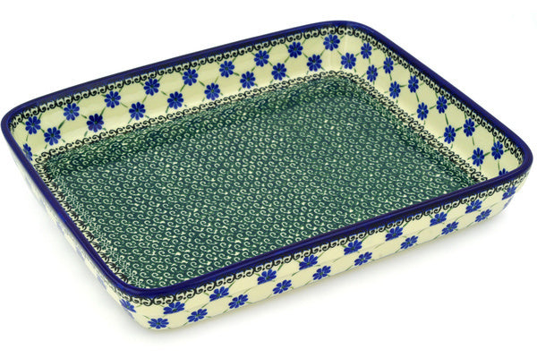 This Blue Daisies 12" Rectangular Baker was handmade and hand decorated in Boleslawiec, Poland by skilled artisans according to old traditional methods. This Polish stoneware is microwave, dishwasher, freezer, and oven safe up to 480°F. It does not contain lead or cadmium. It is part of the Blue Daisies Collection.