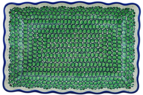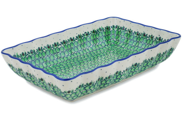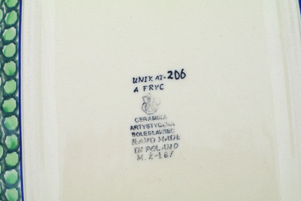 This Cobblestone Path 12" Rectangular Baker was handmade and hand decorated in Boleslawiec, Poland by skilled artisans according to old traditional methods. This is a Polish pottery Signature Unikat, which means that it has been hand painted with both sponges and brushes and it is signed by the artist who painted it. Unikat pieces are the most intricate works of art. Larger Unikat items take hours of very careful work to finish. This Polish stoneware is microwave, dishwasher, freezer, and oven safe up to 480°F. It does not contain lead or cadmium. It is part of the Cobblestone Path Collection.