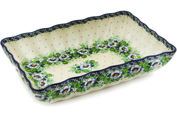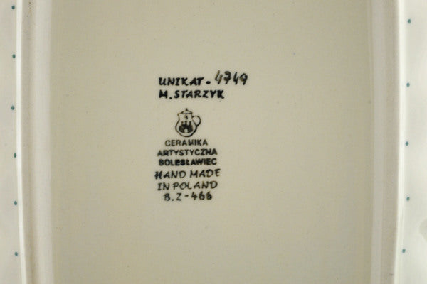 This Daisies Wreath 12" Rectangular Baker was handmade and hand decorated in Boleslawiec, Poland by skilled artisans according to old traditional methods. This is a Polish pottery Signature Unikat, which means that it has been hand painted with both sponges and brushes and it is signed by the artist who painted it. Unikat pieces are the most intricate works of art. Larger Unikat items take hours of very careful work to finish. This Polish stoneware is microwave, dishwasher, freezer, and oven safe up to 480°F. It does not contain lead or cadmium. It is part of the Daisies Wreath Collection.