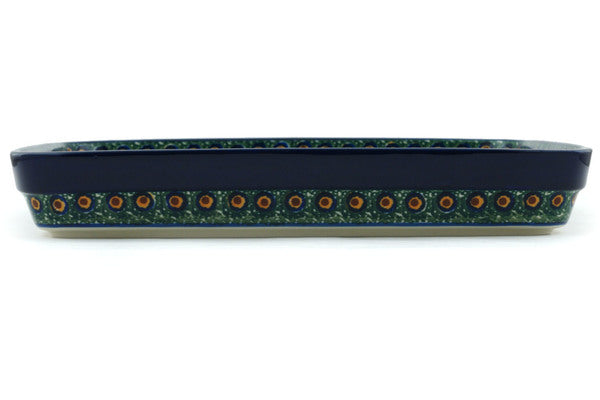 This Emerald Peacock 12" Rectangular Baker was handmade and hand decorated in Boleslawiec, Poland by skilled artisans according to old traditional methods. This Polish stoneware is microwave, dishwasher, freezer, and oven safe up to 480°F. It does not contain lead or cadmium. It is part of the Emerald Peacock Collection.