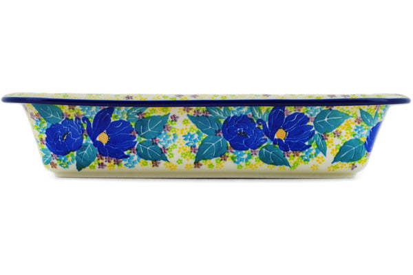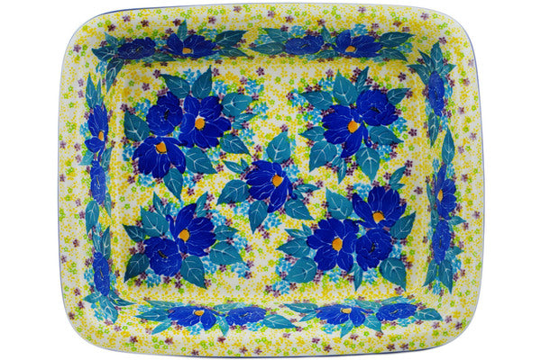 This Jovial 14" Rectangular Baker was handmade and hand decorated in Boleslawiec, Poland by skilled artisans according to old traditional methods. This is a Polish pottery Signature Unikat, which means that it has been hand painted with both sponges and brushes and it is signed by the artist who painted it. Unikat pieces are the most intricate works of art. Larger Unikat items take hours of very careful work to finish. This Polish stoneware is microwave, dishwasher, freezer, and oven safe up to 480°F. It does not contain lead or cadmium. It is part of the Jovial Collection.