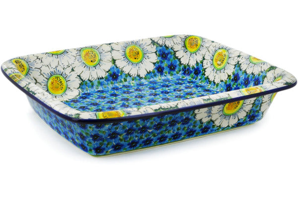 This Pansies And Daisies 14" Rectangular Baker was handmade and hand decorated in Boleslawiec, Poland by skilled artisans according to old traditional methods. This is a Polish pottery Signature Unikat, which means that it has been hand painted with both sponges and brushes and it is signed by the artist who painted it. Unikat pieces are the most intricate works of art. Larger Unikat items take hours of very careful work to finish. This Polish stoneware is microwave, dishwasher, freezer, and oven safe up to 480°F. It does not contain lead or cadmium. It is part of the Pansies And Daisies Collection.