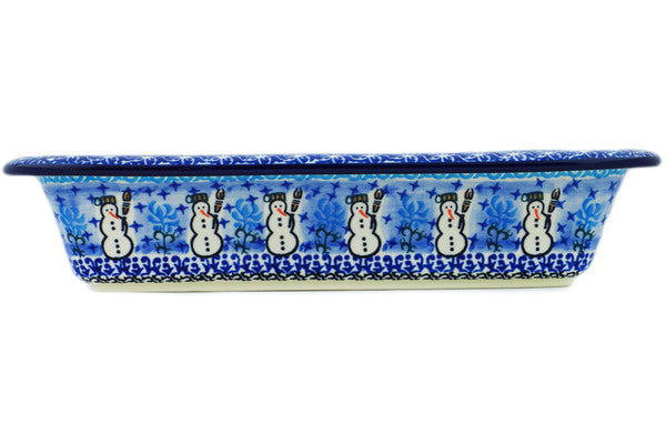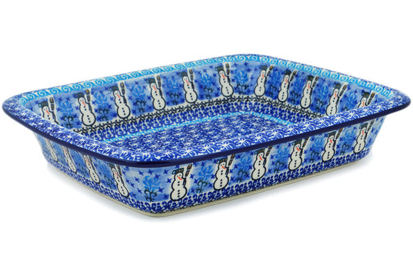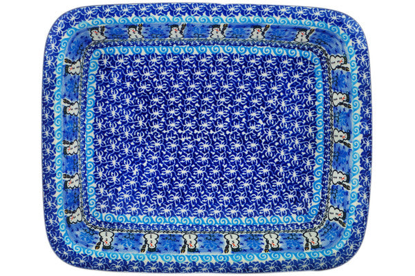 This Snowmen Circle 14" Rectangular Baker was handmade and hand decorated in Boleslawiec, Poland by skilled artisans according to old traditional methods. This is a Polish pottery Signature Unikat, which means that it has been hand painted with both sponges and brushes and it is signed by the artist who painted it. Unikat pieces are the most intricate works of art. Larger Unikat items take hours of very careful work to finish. This Polish stoneware is microwave, dishwasher, freezer, and oven safe up to 480°F. It does not contain lead or cadmium. It is part of the Snowmen Circle Collection.