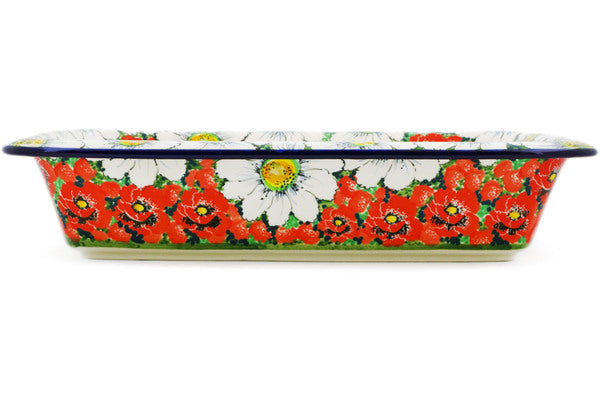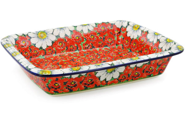 This Sweet Red Petals 14" Rectangular Baker was handmade and hand decorated in Boleslawiec, Poland by skilled artisans according to old traditional methods. This is a Polish pottery Signature Unikat, which means that it has been hand painted with both sponges and brushes and it is signed by the artist who painted it. Unikat pieces are the most intricate works of art. Larger Unikat items take hours of very careful work to finish. This Polish stoneware is microwave, dishwasher, freezer, and oven safe up to 480°F. It does not contain lead or cadmium. It is part of the Sweet Red Petals Collection.