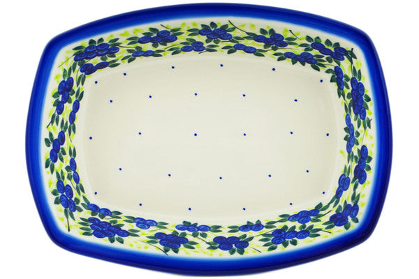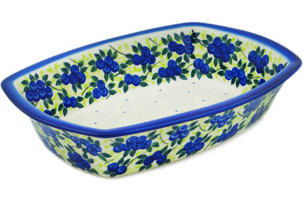 This Blueberries Season 8" Rectangular Baker was handmade and hand decorated in Boleslawiec, Poland by skilled artisans according to old traditional methods. This is a Polish pottery Signature Unikat, which means that it has been hand painted with both sponges and brushes and it is signed by the artist who painted it. Unikat pieces are the most intricate works of art. Larger Unikat items take hours of very careful work to finish. This Polish stoneware is microwave, dishwasher, freezer, and oven safe up to 480°F. It does not contain lead or cadmium. It is part of the Blueberries Season Collection.