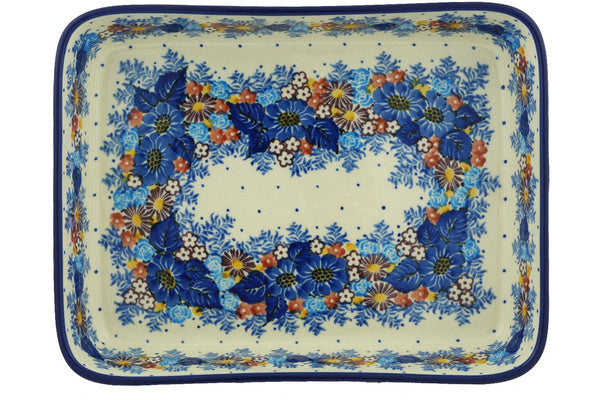 This Flower Wreath 9" Rectangular Baker was handmade and hand decorated in Boleslawiec, Poland by skilled artisans according to old traditional methods. This is a Polish pottery Signature Unikat, which means that it has been hand painted with both sponges and brushes and it is signed by the artist who painted it. Unikat pieces are the most intricate works of art. Larger Unikat items take hours of very careful work to finish. This Polish stoneware is microwave, dishwasher, freezer, and oven safe up to 480°F. It does not contain lead or cadmium. It is part of the Flower Wreath Collection.