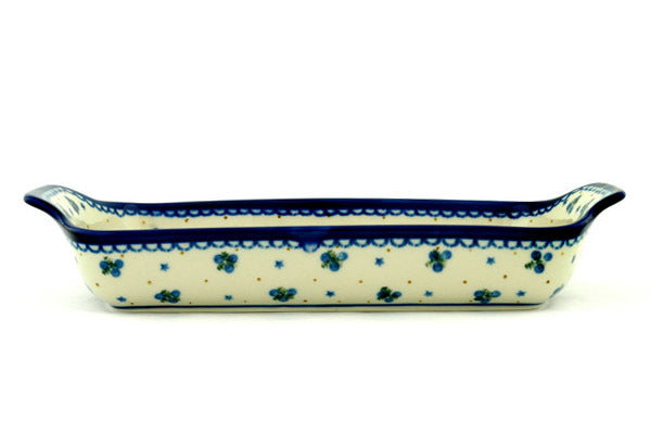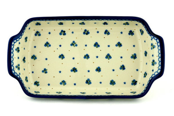 This Blueberry Stars 13" Rectangular Baker with Handles was handmade and hand decorated in Boleslawiec, Poland by skilled artisans according to old traditional methods. This Polish stoneware is microwave, dishwasher, freezer, and oven safe up to 480°F. It does not contain lead or cadmium. It is part of the Blueberry Stars Collection.