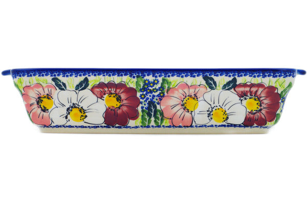 This Maroon Blossoms 15" Rectangular Baker with Handles was handmade and hand decorated in Boleslawiec, Poland by skilled artisans according to old traditional methods. This is a Polish pottery Signature Unikat, which means that it has been hand painted with both sponges and brushes and it is signed by the artist who painted it. Unikat pieces are the most intricate works of art. Larger Unikat items take hours of very careful work to finish. This Polish stoneware is microwave, dishwasher, freezer, and oven safe up to 480°F. It does not contain lead or cadmium. It is part of the Maroon Blossoms Collection.