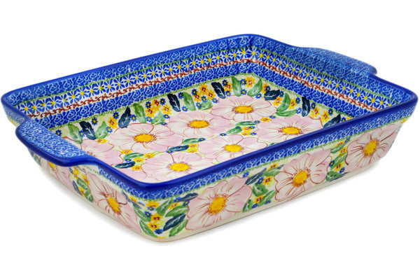 This Pink Delight 15" Rectangular Baker with Handles was handmade and hand decorated in Boleslawiec, Poland by skilled artisans according to old traditional methods. This is a Polish pottery Signature Unikat, which means that it has been hand painted with both sponges and brushes and it is signed by the artist who painted it. Unikat pieces are the most intricate works of art. Larger Unikat items take hours of very careful work to finish. This Polish stoneware is microwave, dishwasher, freezer, and oven safe up to 480°F. It does not contain lead or cadmium. It is part of the Pink Delight Collection.
