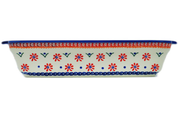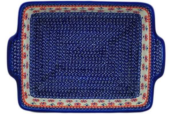 This Red Daisy 15" Rectangular Baker with Handles was handmade and hand decorated in Boleslawiec, Poland by skilled artisans according to old traditional methods. This Polish stoneware is microwave, dishwasher, freezer, and oven safe up to 480°F. It does not contain lead or cadmium. It is part of the Red Daisy Collection.