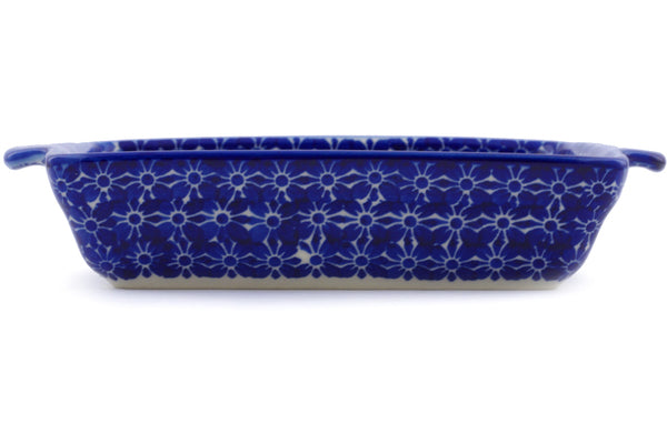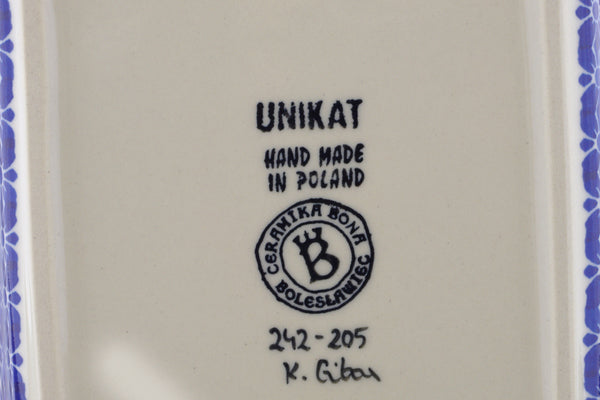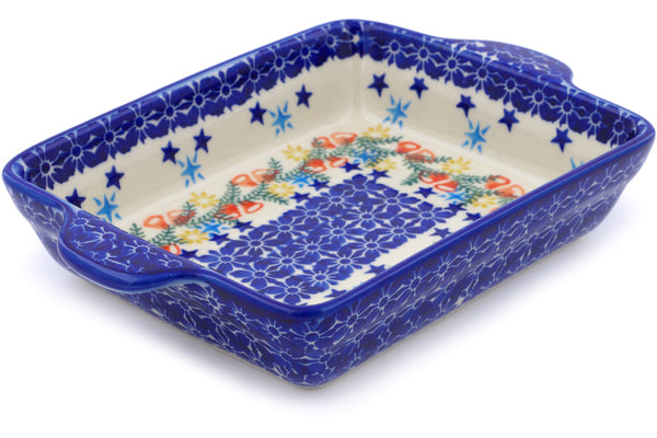 This Wreath Of Bells 9" Rectangular Baker with Handles was handmade and hand decorated in Boleslawiec, Poland by skilled artisans according to old traditional methods. This Polish stoneware is microwave, dishwasher, freezer, and oven safe up to 480°F. It does not contain lead or cadmium. It is part of the Wreath Of Bells Collection.