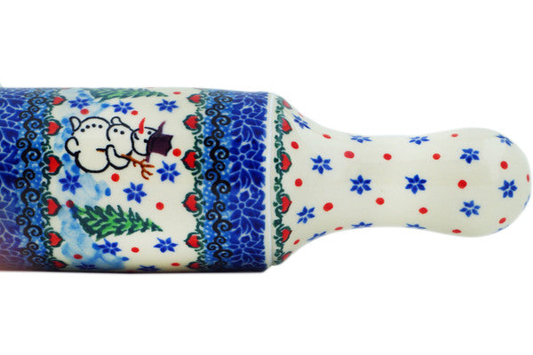 This Dancing Snowman 18" Rolling Pin was handmade and hand decorated in Boleslawiec, Poland by skilled artisans according to old traditional methods. This is a Polish pottery Signature Unikat, which means that it has been hand painted with both sponges and brushes and it is signed by the artist who painted it. Unikat pieces are the most intricate works of art. Larger Unikat items take hours of very careful work to finish. This Polish stoneware is microwave, dishwasher, freezer, and oven safe up to 480°F. It does not contain lead or cadmium. It is part of the Dancing Snowman Collection.