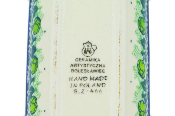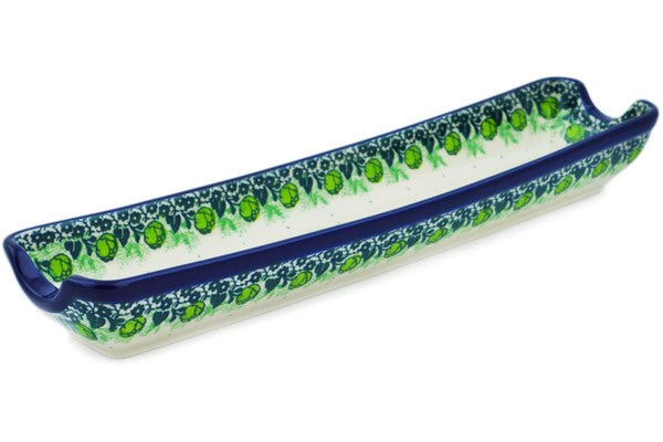 This Green Flora 13" Rolling Pin Cradle was handmade and hand decorated in Boleslawiec, Poland by skilled artisans according to old traditional methods. This Polish stoneware is microwave, dishwasher, freezer, and oven safe up to 480°F. It does not contain lead or cadmium. It is part of the Green Flora Collection.