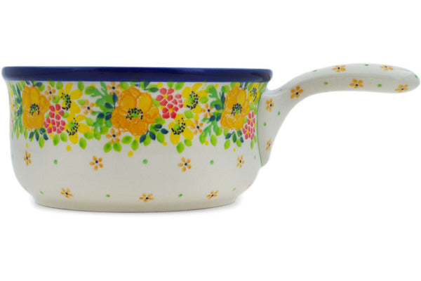 This Bright Spring 10" Round Baker with Handles was handmade and hand decorated in Boleslawiec, Poland by skilled artisans according to old traditional methods. This is a Polish pottery Signature Unikat, which means that it has been hand painted with both sponges and brushes and it is signed by the artist who painted it. Unikat pieces are the most intricate works of art. Larger Unikat items take hours of very careful work to finish. This Polish stoneware is microwave, dishwasher, freezer, and oven safe up to 480°F. It does not contain lead or cadmium. It is part of the Bright Spring Collection.