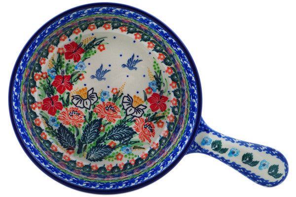 This Dove Escape 10" Round Baker with Handles was handmade and hand decorated in Boleslawiec, Poland by skilled artisans according to old traditional methods. This is a Polish pottery Signature Unikat, which means that it has been hand painted with both sponges and brushes and it is signed by the artist who painted it. Unikat pieces are the most intricate works of art. Larger Unikat items take hours of very careful work to finish. This Polish stoneware is microwave, dishwasher, freezer, and oven safe up to 480°F. It does not contain lead or cadmium. It is part of the Dove Escape Collection.