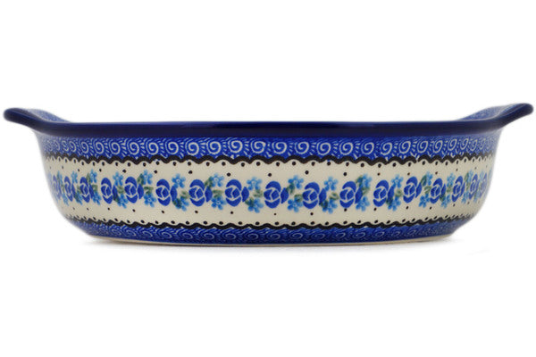 This Blue Bud Sea 10-inch Round Baker with Handles was handmade and hand decorated in Boleslawiec, Poland by skilled artisans according to old traditional methods. This Polish stoneware is microwave, dishwasher, freezer, and oven safe up to 480°F. It does not contain lead or cadmium. It is part of the Blue Bud Sea Collection.