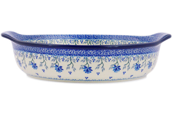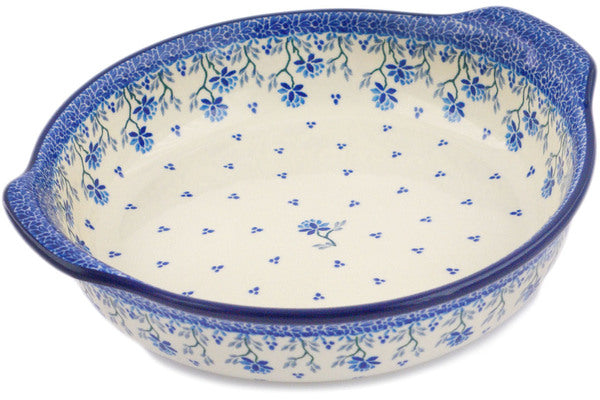 This Blue Grapevine 10-inch Round Baker with Handles was handmade and hand decorated in Boleslawiec, Poland by skilled artisans according to old traditional methods. This Polish stoneware is microwave, dishwasher, freezer, and oven safe up to 480°F. It does not contain lead or cadmium. It is part of the Blue Grapevine Collection.