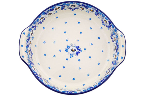 This Blue Spring 10-inch Round Baker with Handles was handmade and hand decorated in Boleslawiec, Poland by skilled artisans according to old traditional methods. This Polish stoneware is microwave, dishwasher, freezer, and oven safe up to 480°F. It does not contain lead or cadmium. It is part of the Blue Spring Collection.