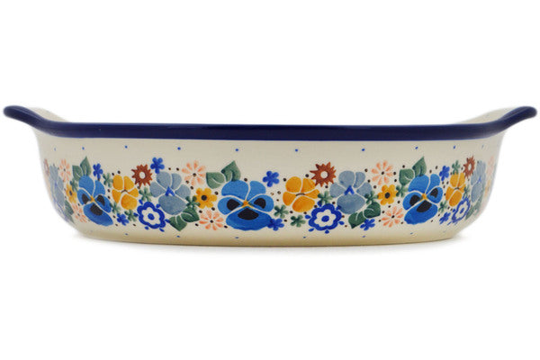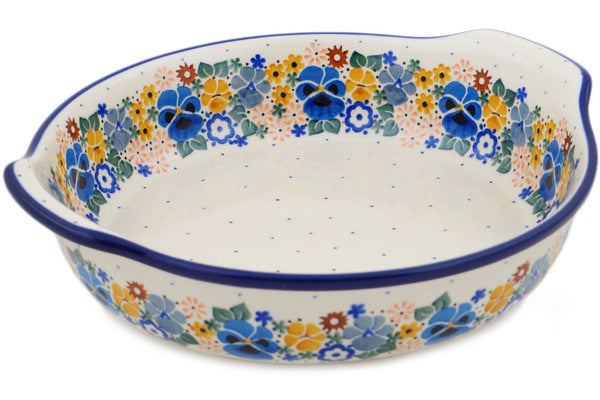 This Pansy Wreath 10-inch Round Baker with Handles was handmade and hand decorated in Boleslawiec, Poland by skilled artisans according to old traditional methods. This is a Polish pottery Signature Unikat, which means that it has been hand painted with both sponges and brushes and it is signed by the artist who painted it. Unikat pieces are the most intricate works of art. Larger Unikat items take hours of very careful work to finish. This Polish stoneware is microwave, dishwasher, freezer, and oven safe up to 480°F. It does not contain lead or cadmium. It is part of the Pansy Wreath Collection.