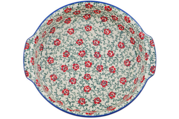 This Rose Vines 10-inch Round Baker with Handles was handmade and hand decorated in Boleslawiec, Poland by skilled artisans according to old traditional methods. This is a Polish pottery Signature Unikat, which means that it has been hand painted with both sponges and brushes and it is signed by the artist who painted it. Unikat pieces are the most intricate works of art. Larger Unikat items take hours of very careful work to finish. This Polish stoneware is microwave, dishwasher, freezer, and oven safe up to 480°F. It does not contain lead or cadmium. It is part of the Rose Vines Collection.