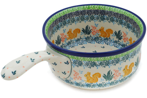 This Nuts About You 10" Round Baker with Handles was handmade and hand decorated in Boleslawiec, Poland by skilled artisans according to old traditional methods. This is a Polish pottery Signature Unikat, which means that it has been hand painted with both sponges and brushes and it is signed by the artist who painted it. Unikat pieces are the most intricate works of art. Larger Unikat items take hours of very careful work to finish. This Polish stoneware is microwave, dishwasher, freezer, and oven safe up to 480°F. It does not contain lead or cadmium. It is part of the Nuts About You Collection.